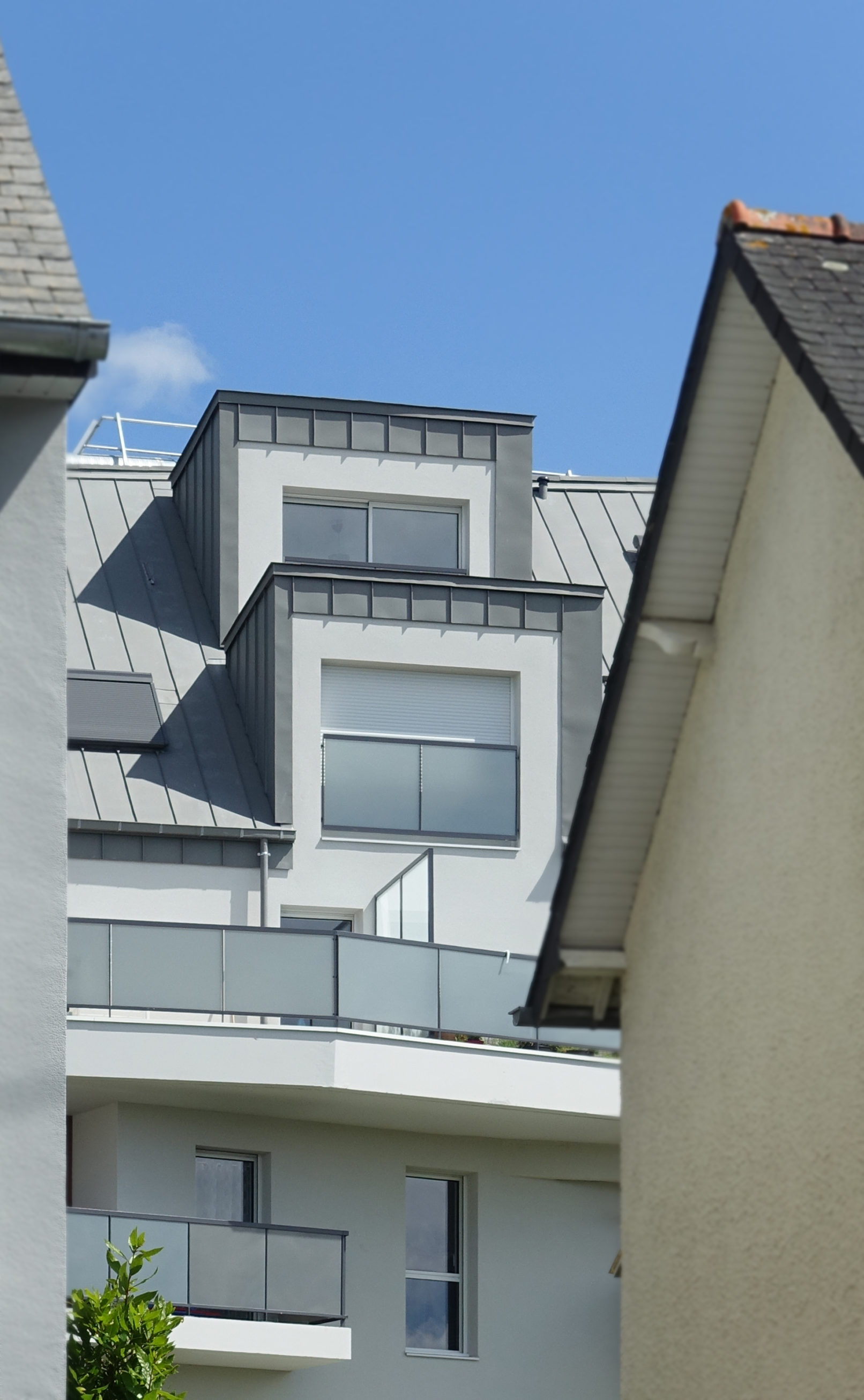 La façade, rythmée par un ordonnancement d’ouvertures verticales, présente plusieurs « événements » architecturaux. Ces trois trames de loggias colorées surplombées par des lucarnes en zinc, en harmonie avec la façade dans son ensemble, lui apportent par leur composition singulière des variations bienvenues. Les teintes choisies, une dominante claire ponctuée de touches de gris associée à un ton brun plus chaleureux, participent à l’allure contemporaine de l’ensemble tout en s’accordant avec les couleurs des maisons en pierre voisines et du mur du cimetière.