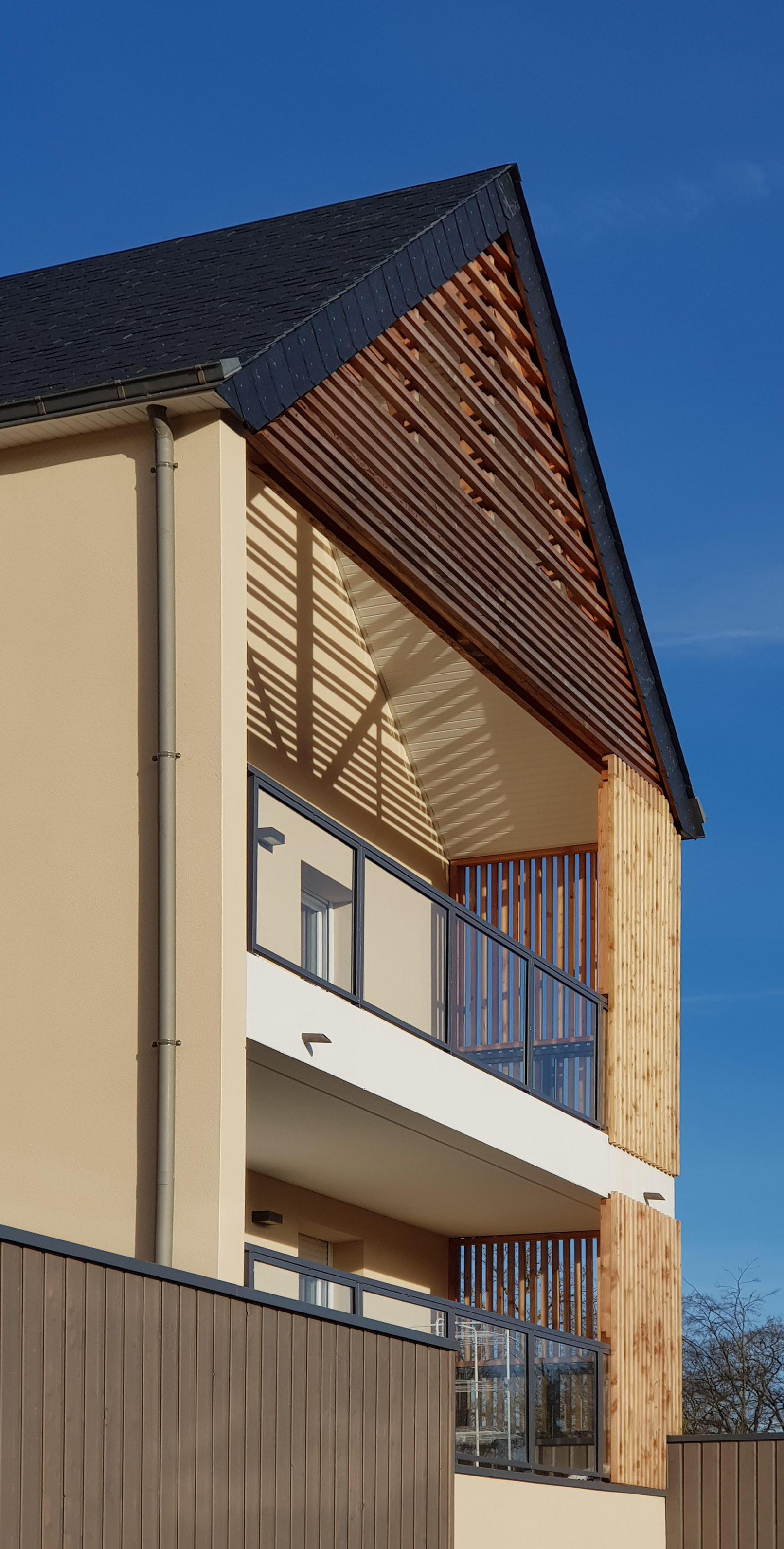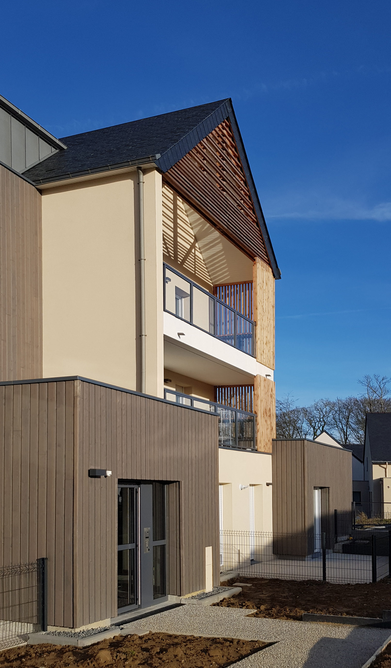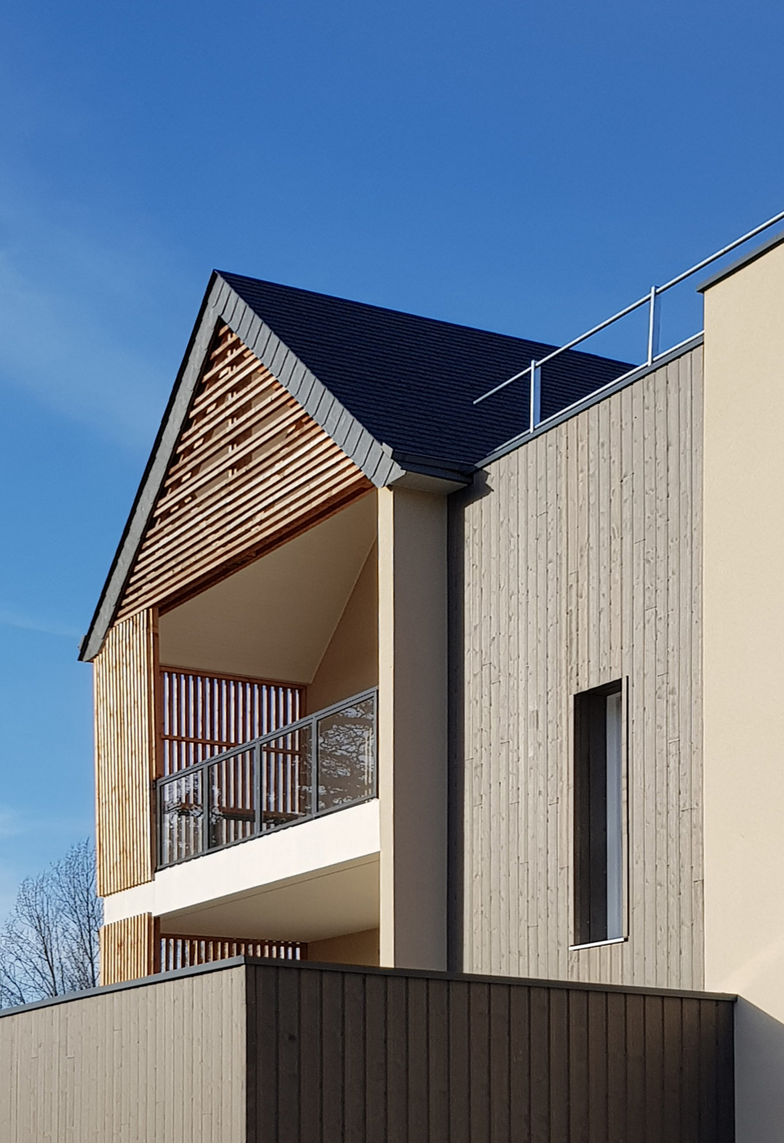 Les façades, mêlant une écriture contemporaine à des éléments traditionnels, sont rythmées par une alternance de pleins et de vides, d’enduit et de bardage bois.