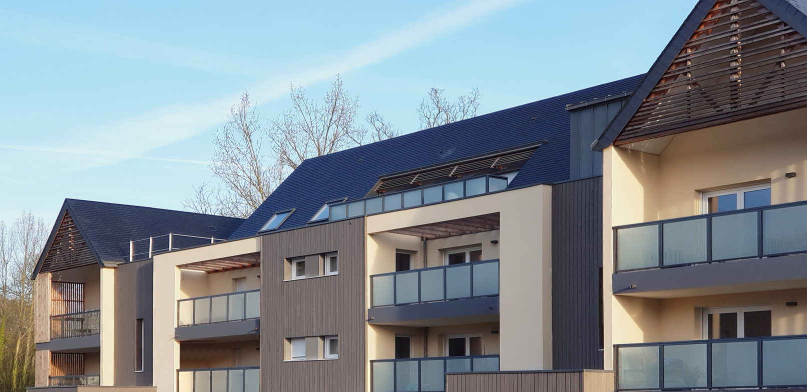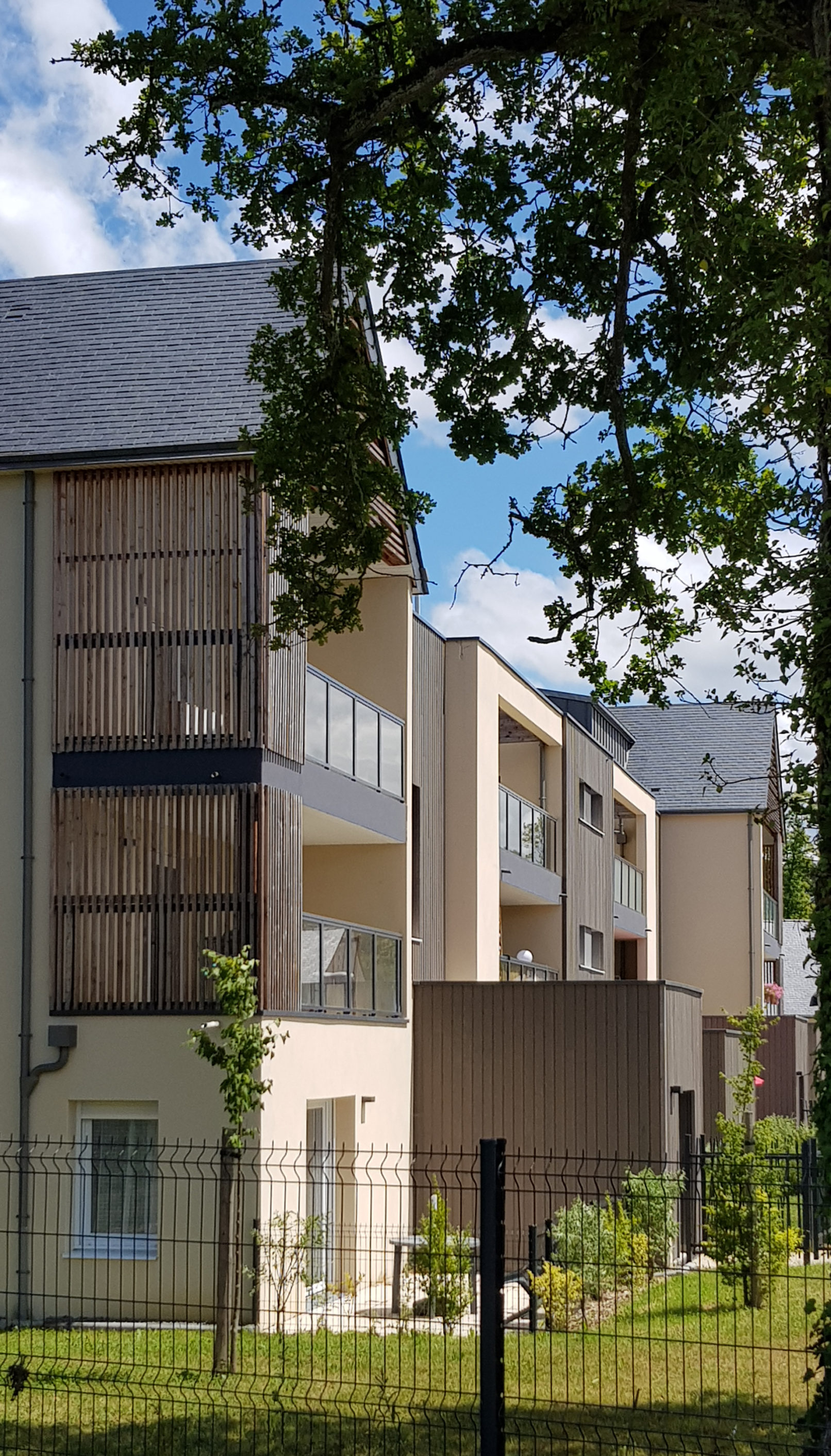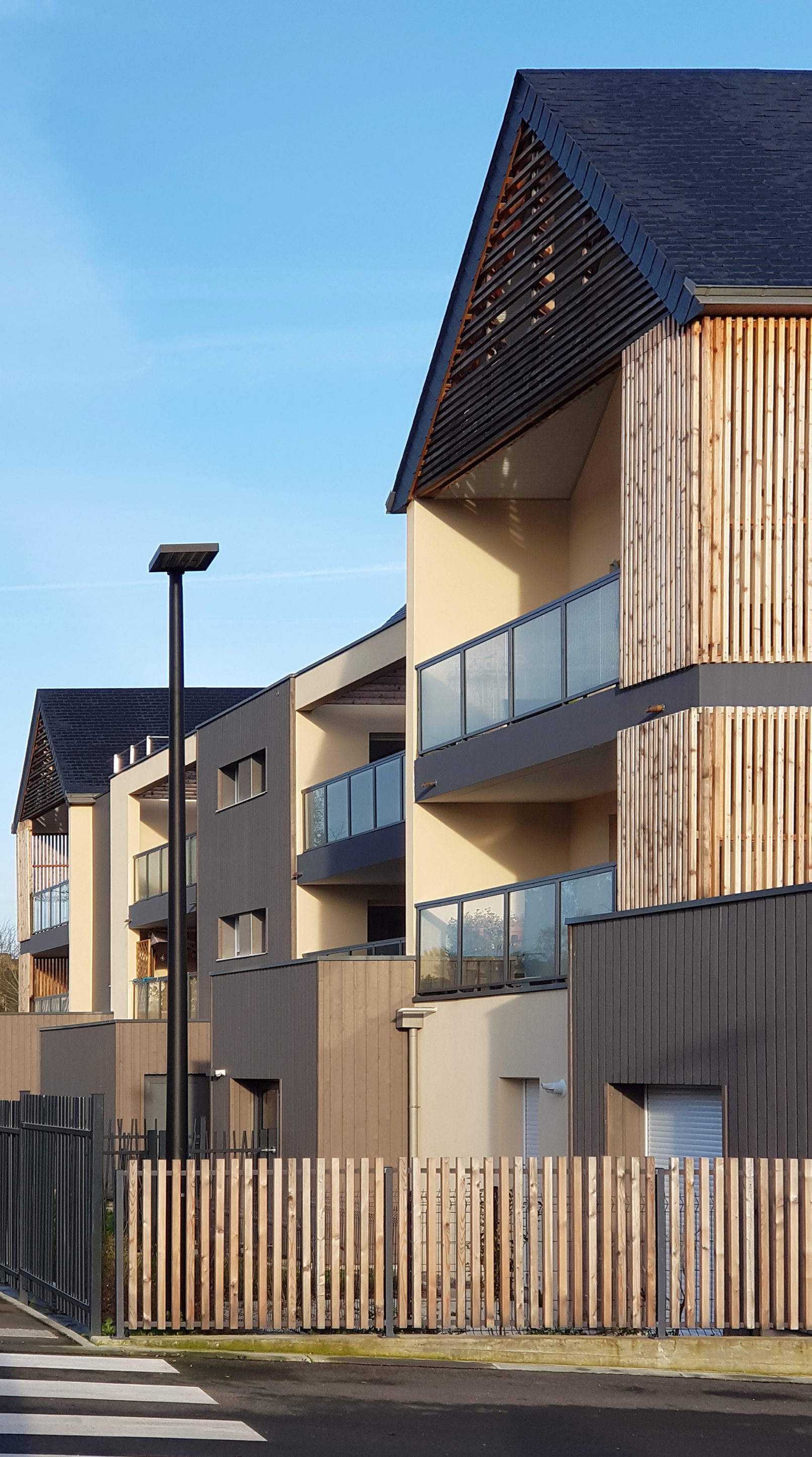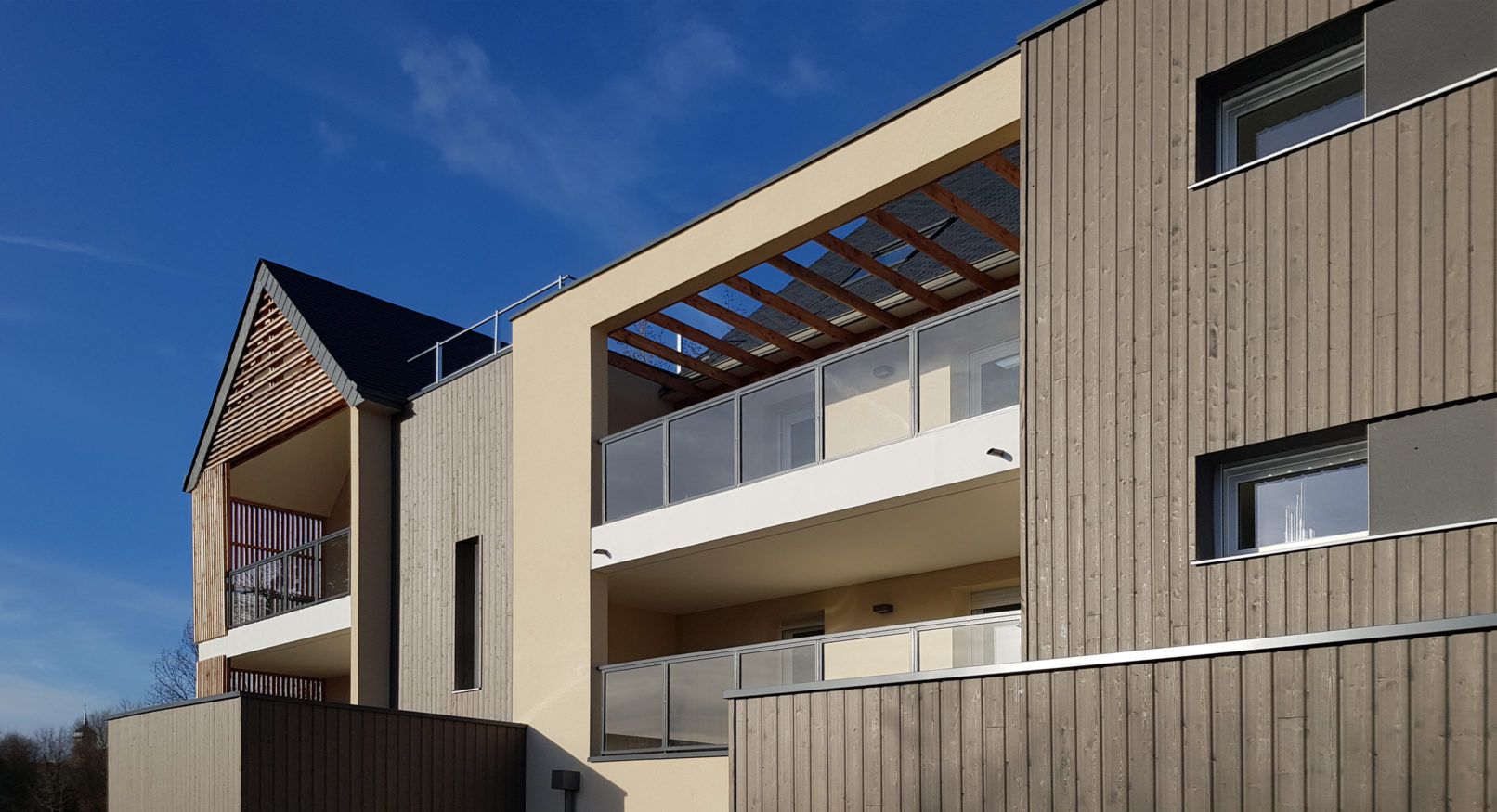 Les façades, mêlant une écriture contemporaine à des éléments traditionnels, sont rythmées par une alternance de pleins et de vides, d’enduit et de bardage bois.
