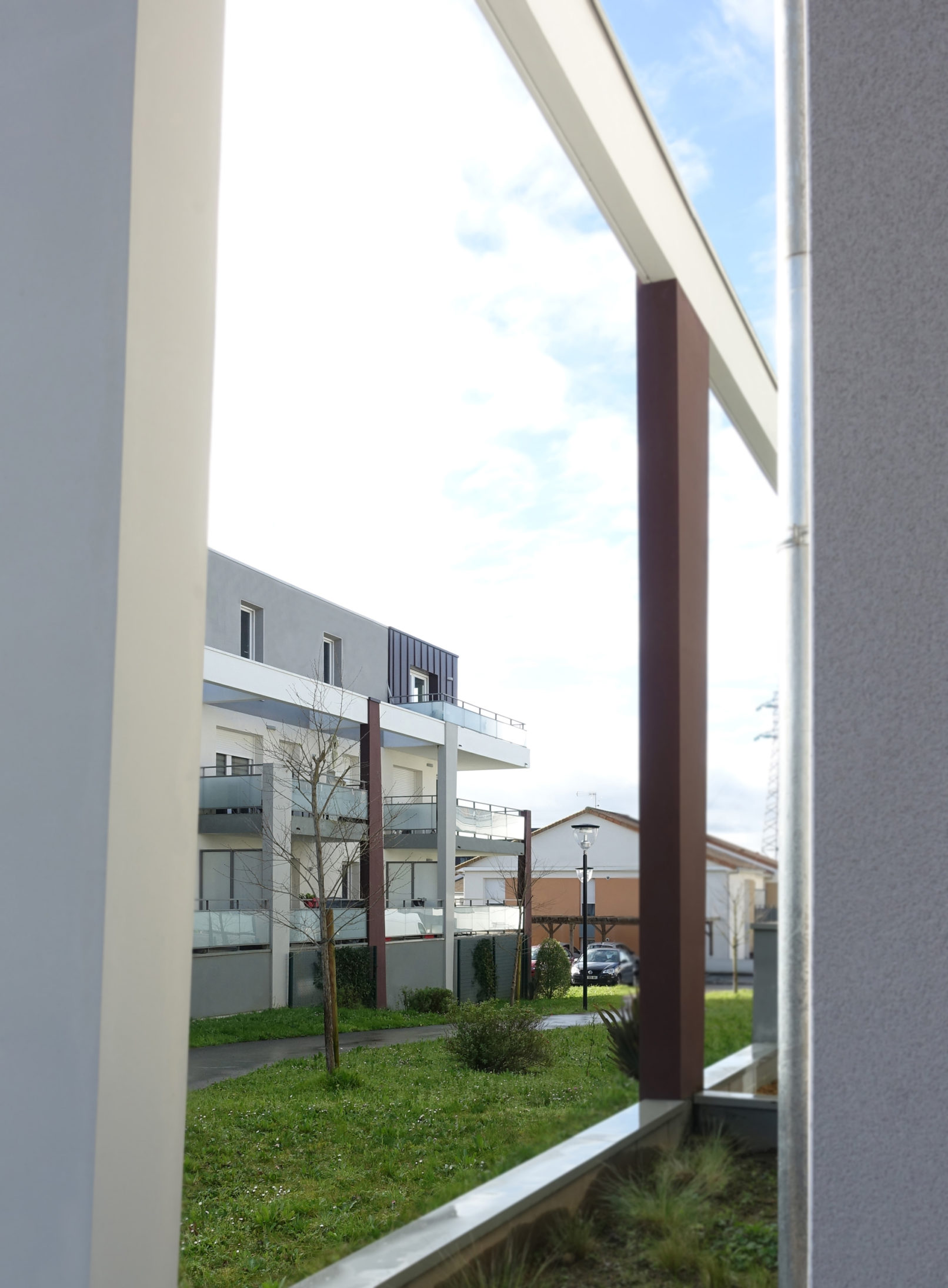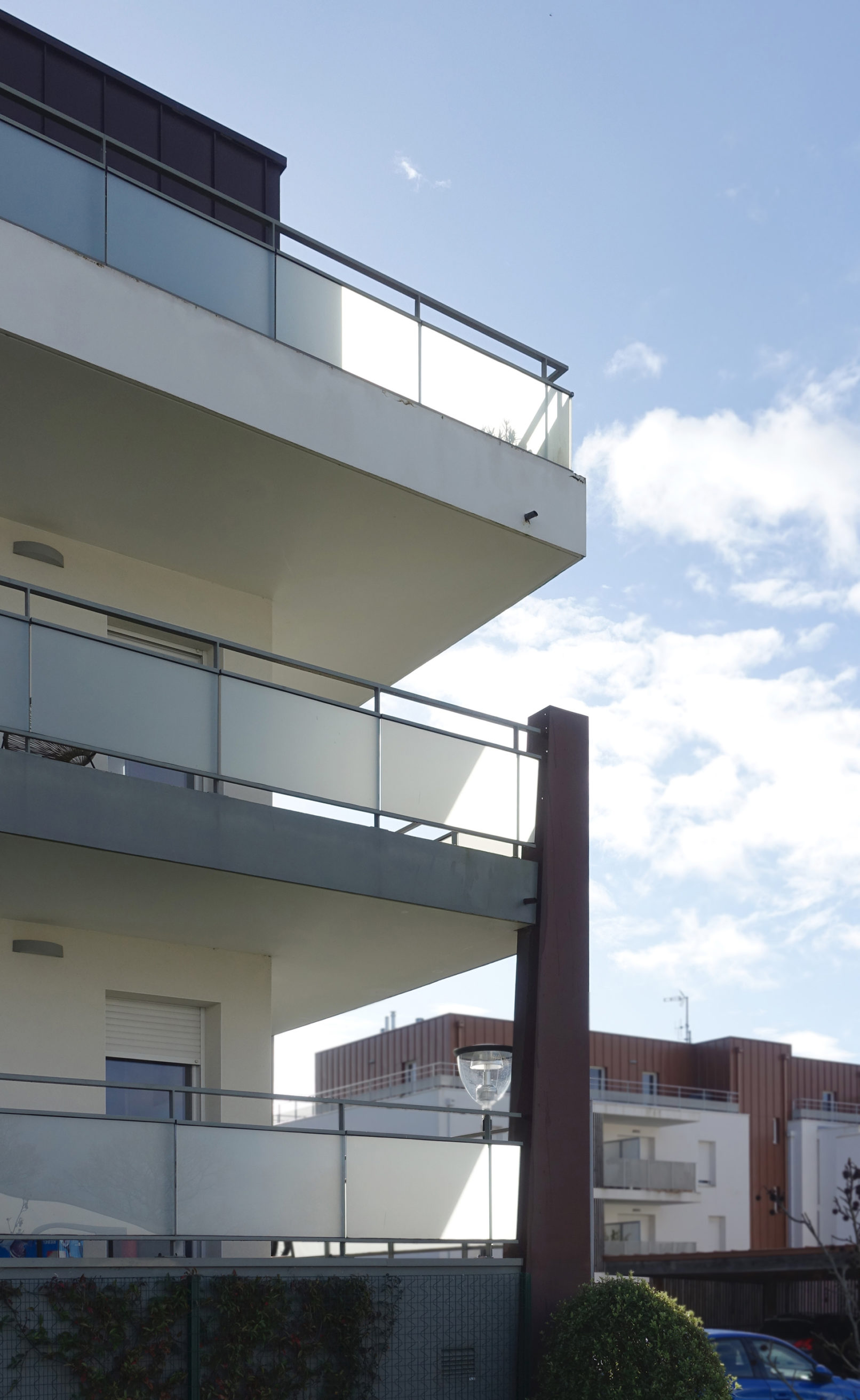 Des éléments verticaux en béton peint aux formes aléatoires sont autant de «troncs» formant une forêt abstraite qui, greffée aux façades, soutient les balcons en saillie.