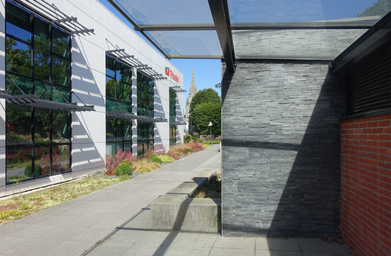 La restructuration a permis de redessiner complètement la partie accueil de la société située dans un virage et collée à la voie. Ainsi, un véritable trottoir a pu être créé et un hall d’accès courbé épousant la rue marque à présent l’entrée de l’entreprise.