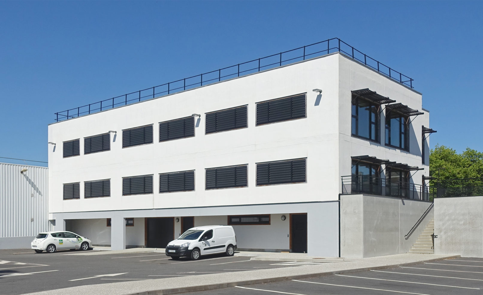 Premier bâtiment tertiaire d’une telle superficie ( environ 1000 m² sur trois niveaux) construit en panneaux préfabriqués de béton de chanvre. Il comprend deux niveaux de bureaux et un espace de stockage ainsi que des vestiaires au niveau inférieur semi-enterré.