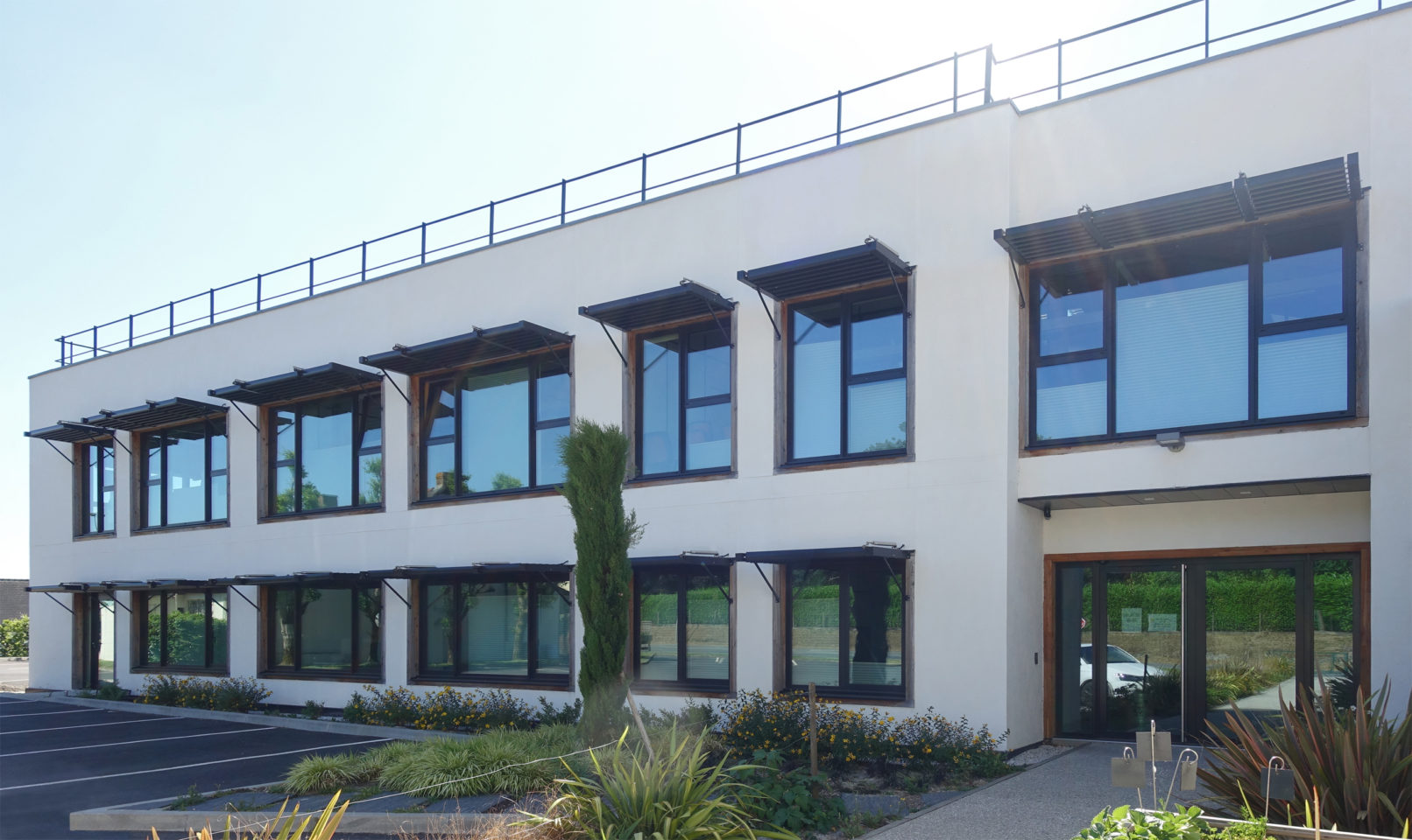 Les façades est et sud comportent de grandes baies vitrées sur lesquelles sont fixés des casquettes horizontales permettant de réguler les apports solaires. La façade ouest, quant à elle, développe un important linéaire comportant également de généreuses baies vitrées protégées par des brise-soleil verticaux.