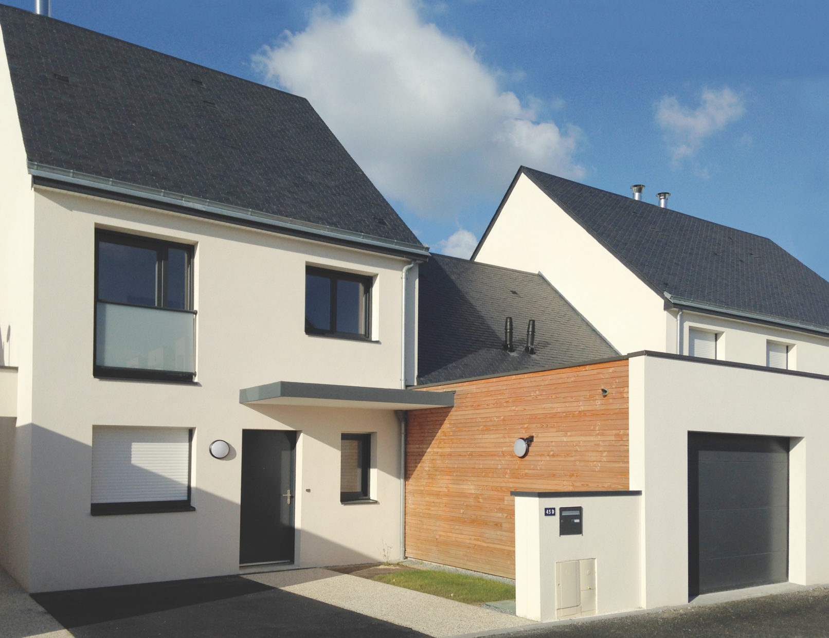 Les différentes typologies de logements cohabitent harmonieusement sur la parcelle. Malgré des volumétries variées, l’impression d’homogénéité domine grâce à l’utilisation de matériaux communs à savoir le bardage en bois naturel, le zinc quartz, l’ardoise ainsi que des tons d’enduit blanc et gris soutenu.